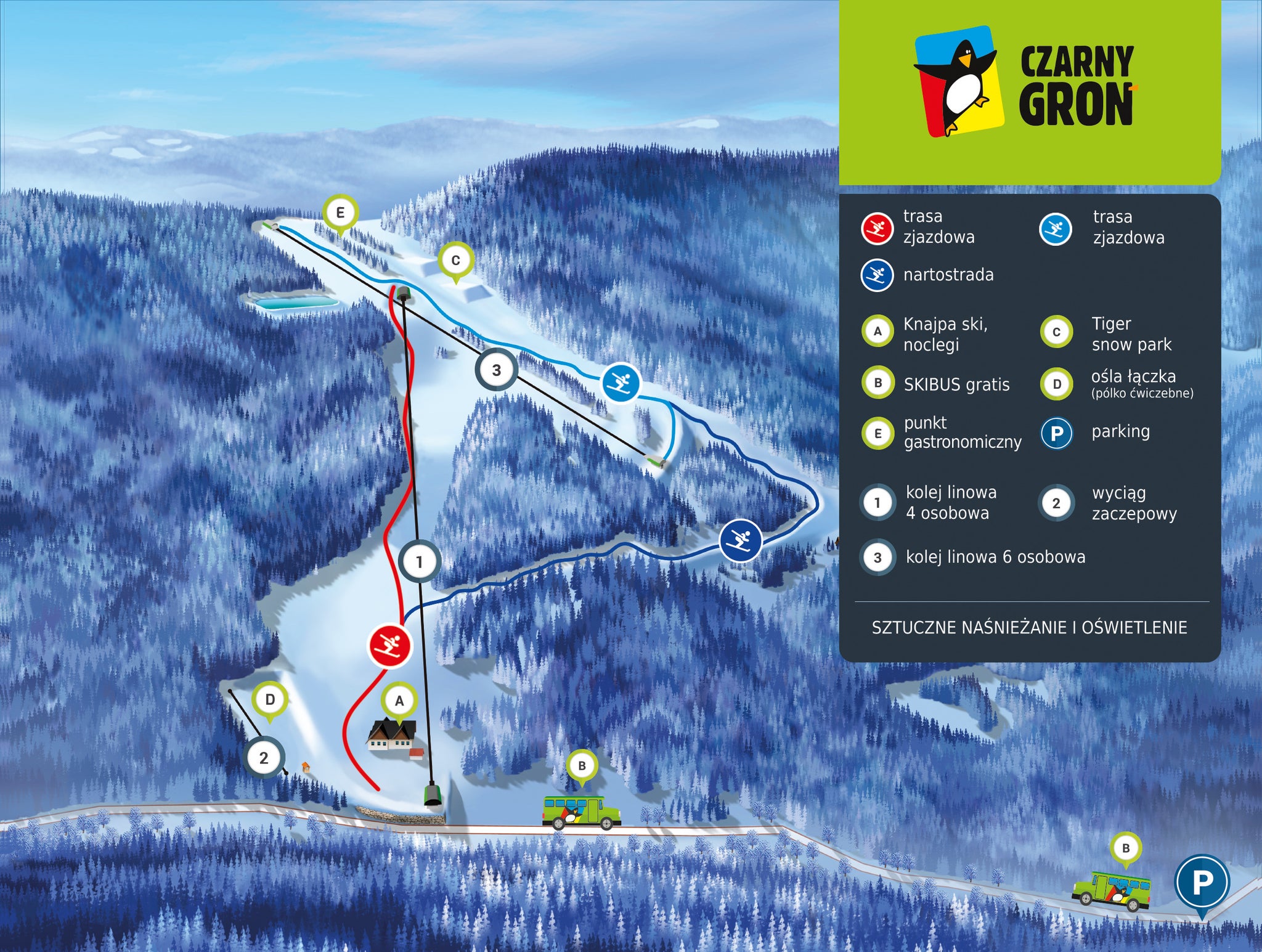 Oferta tras narciarskichZielone trasy9%Niebieskie trasy59%Czerwone trasy32%Trasy ogółem4Najdłuższa trasa2.1 kmTeren narciarski2.2 kmNocne jazdy2.2 km