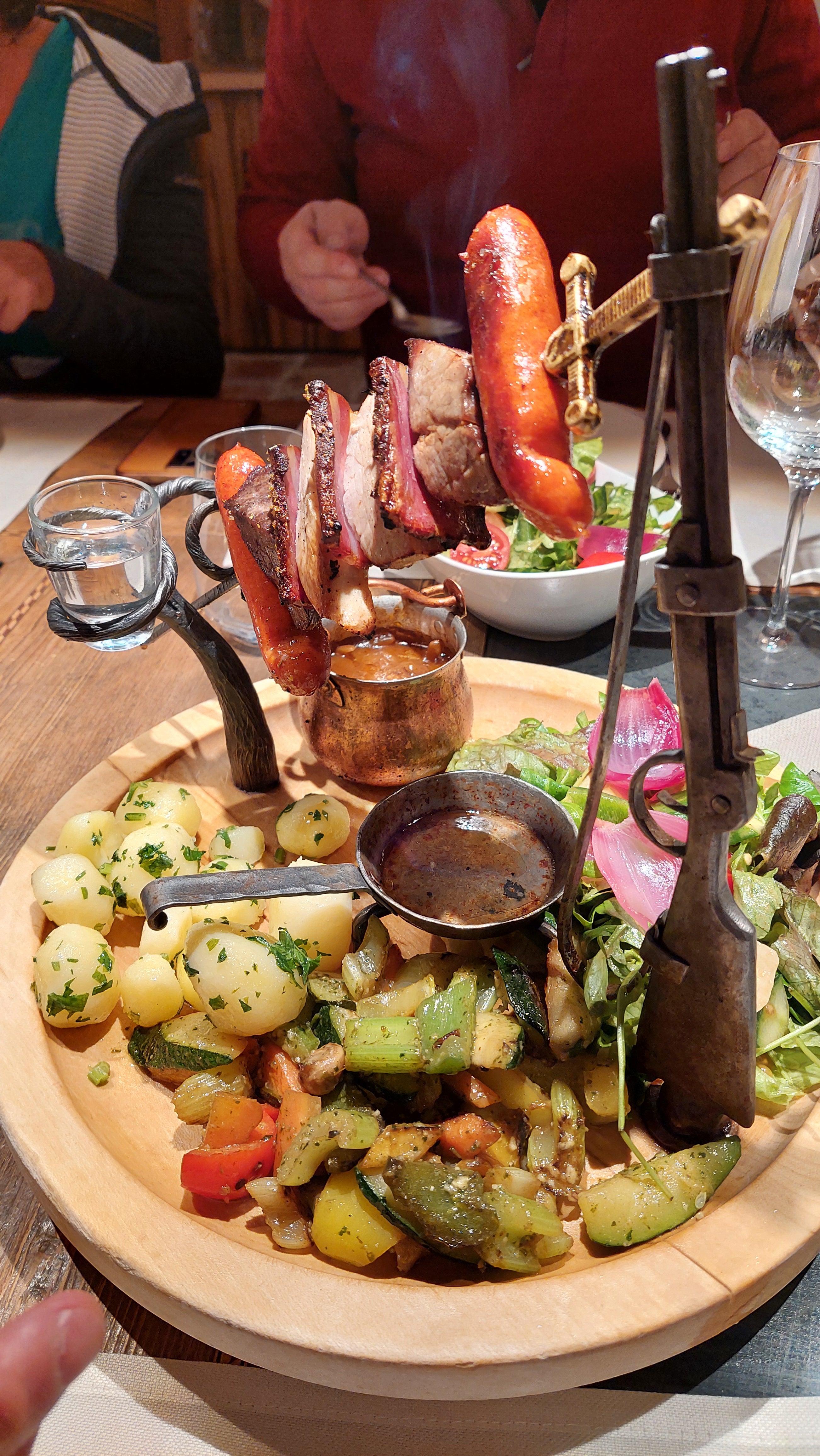 My spędziliśmy smakowity wieczór w piwniczce Hotelu Zehnerkar. Było pysznie i …kreatywnie. Wildererspiess, specjalność lokalu, czyli marynowane mięso z sosem grzybowym, ziemniaczkami z pietruszką, bukietem sałat i tradycyjnym lokalnym sznapsem, zachwyciła nie tylko smakiem, ale i wyglądem. Całość podano na miniaturowym ruszcie, na którym mięsko powoli podpiekało się w żywym ogniu. Mniam.